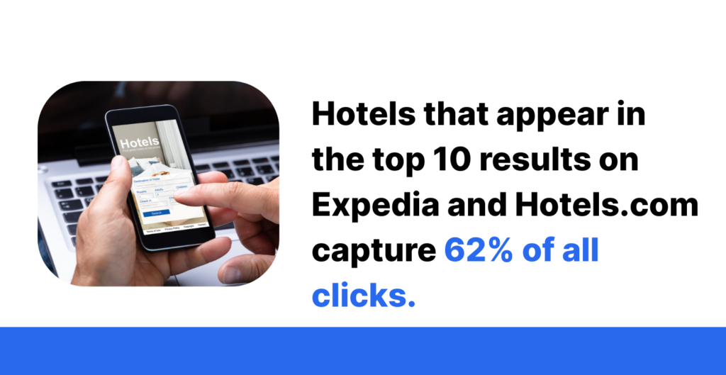 • Higher search rankings:.According to Expedia, reviews and management responses influence property visibility in search results. Hotels that rank within the top 10 on Expedia and Hotels.com capture 62% of clicks and as platforms like ChatGPT begin surfacing Expedia listings in conversational searches, this visibility advantage will only grow.