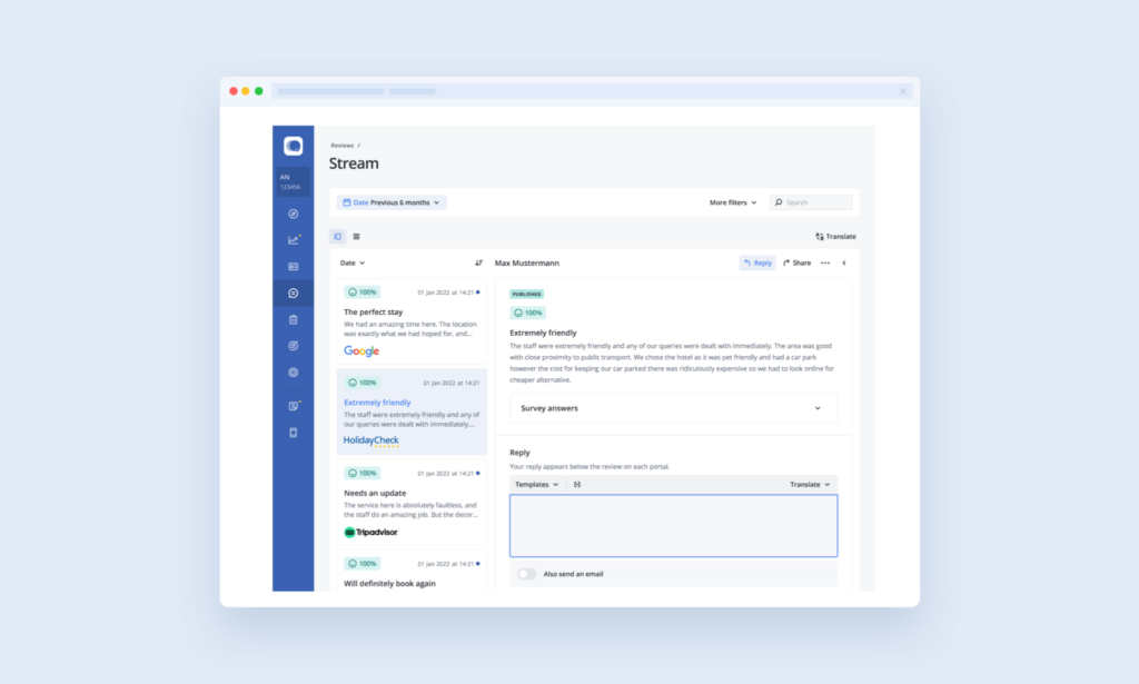 Pour gagner encore plus de temps, AI Reply Assistant génère des réponses personnalisées en quelques secondes en analysant chaque avis et en proposant des textes naturels et professionnels. Les hôtels conservent un contrôle total, avec la possibilité d’ajuster les réponses avant publication afin de rester fidèles à leur image de marque.