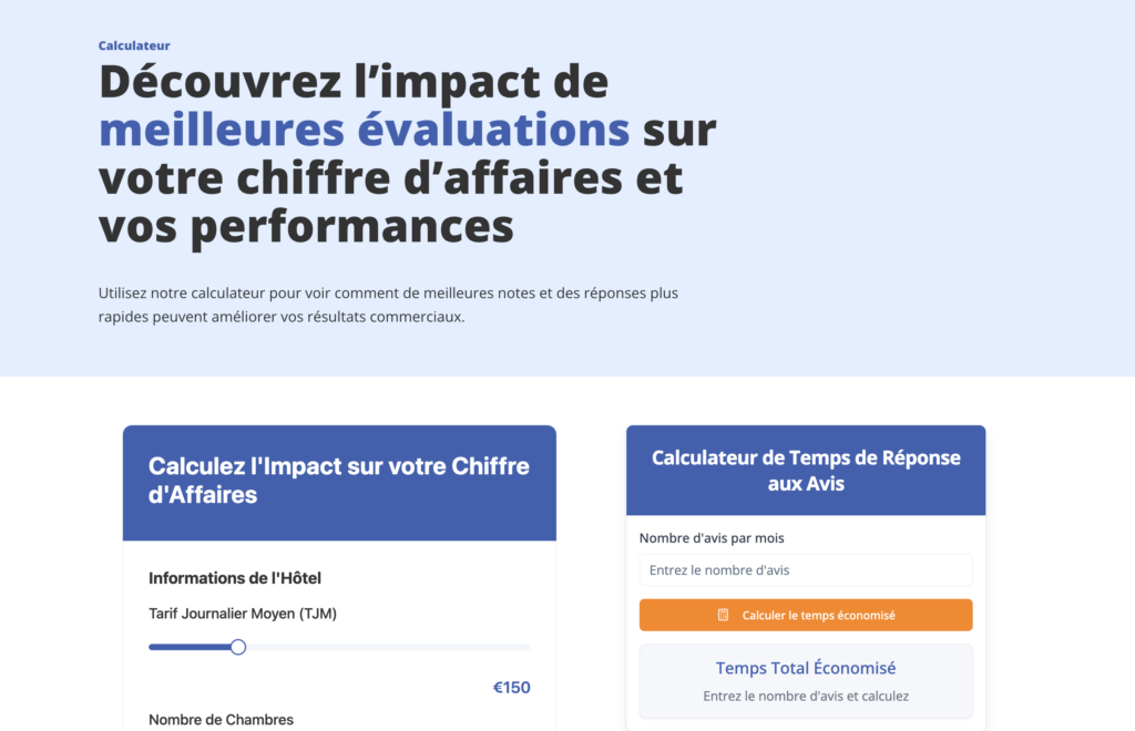C’est une façon simple d’explorer comment les améliorations de réputation peuvent soutenir les objectifs financiers de votre hôtel, à partir de données réelles, et non d’hypothèses